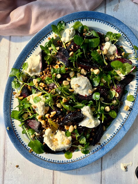 Warm sticky beetroot salad with crispy lentils and cheat’s burrata
